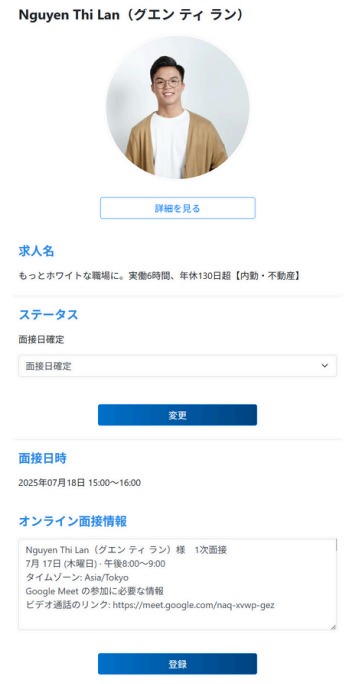 求職者の詳細画面を開き、ページ下部の入力欄にオンライン面接用のURLをご記入ください。
